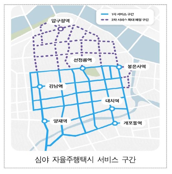 '심야 자율주행 택시'의 운행 지역은 강남구 역삼동, 대치동, 도곡동, 삼성동과 서초구 서초동 일부의 지역입니다. 동서축과 남북축으로 구분하여 주요 도로에서 우선 운영되는데, 동서축에는 봉은사로, 테헤란로, 도곡로, 남부순환로, 개포로가 포함되며, 남북축에는 강남대로, 논현로, 언주로, 삼성로, 영동대로가 포함됩니다.